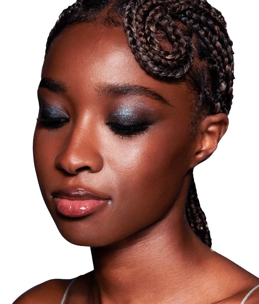 • Occhi: stendere SWEETIELOVE LIQUID ECLISSE su tutta la palpebra per creare la base smokey del look. Applicare poi SWEETIELOVE SILVER AURORA sopra su tutta la palpebra per creare riflessi duochrome.